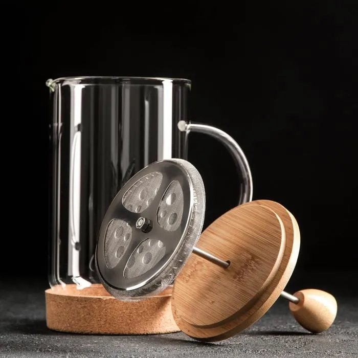 Стеклянный френч-пресс хорошо держит тепло, раскрывает вкус любимых напитков. Стальной поршень не вступает в реакцию с жидкостью, не наделяет ее металлическим привкусом.Принцип работы френч-пресса прост: