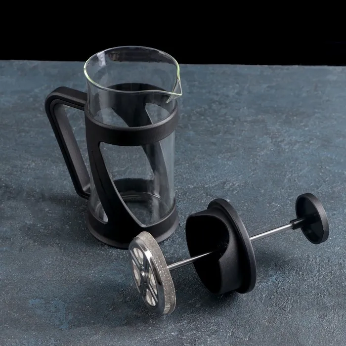 Стеклянный френч-пресс хорошо держит тепло, раскрывает вкус любимых напитков. Стальной поршень не вступает в реакцию с жидкостью, не наделяет ее металлическим привкусом.Принцип работы френч-пресса прост: