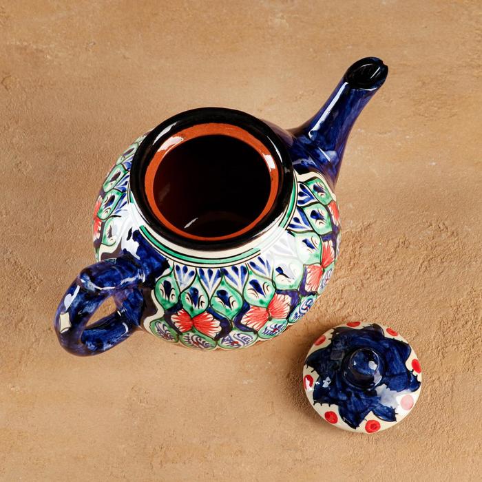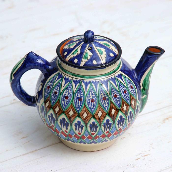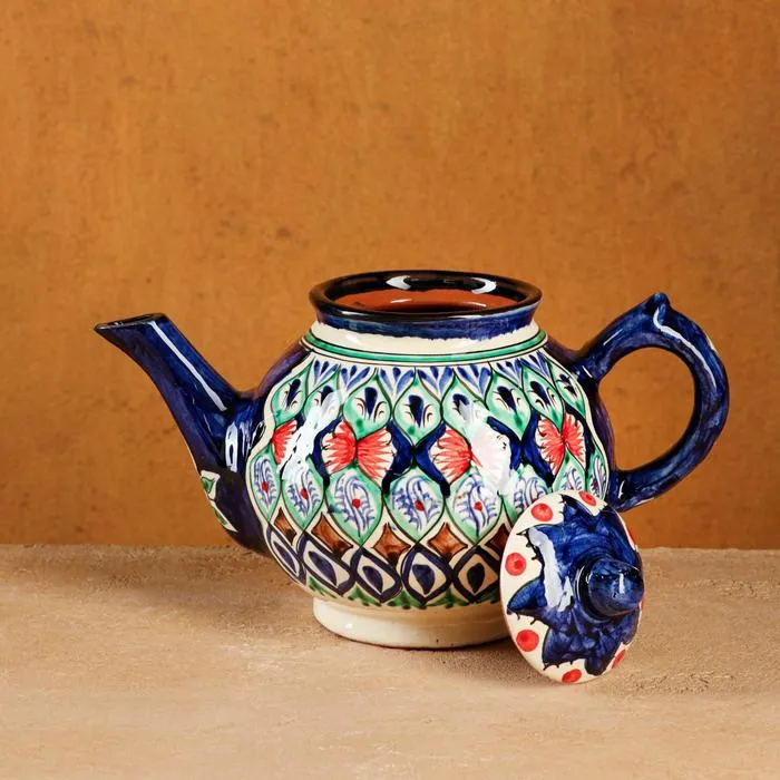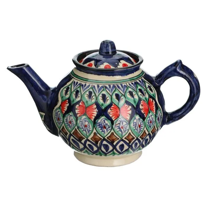 Чайник вдохновлён знаменитой риштанской керамикой, где каждая деталь создаётся вручную. Растительный орнамент напоминает узоры, традиционные для узбекского декора — такие же, как на старинных посудинах из Риштана. Такое изделие органично дополнит интерьер кухни, наполненной этническими мотивами или современной кухней в восточном стиле.