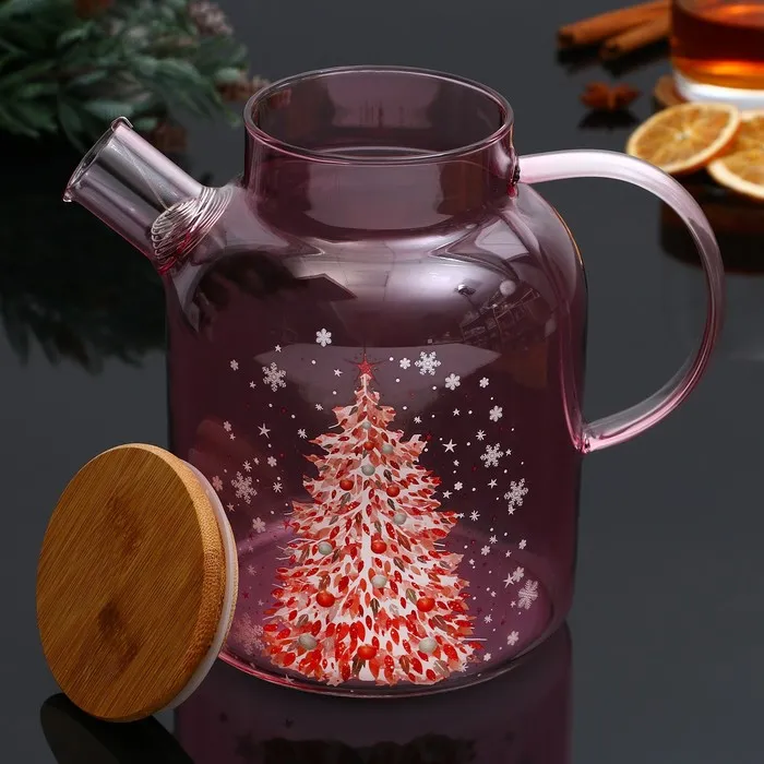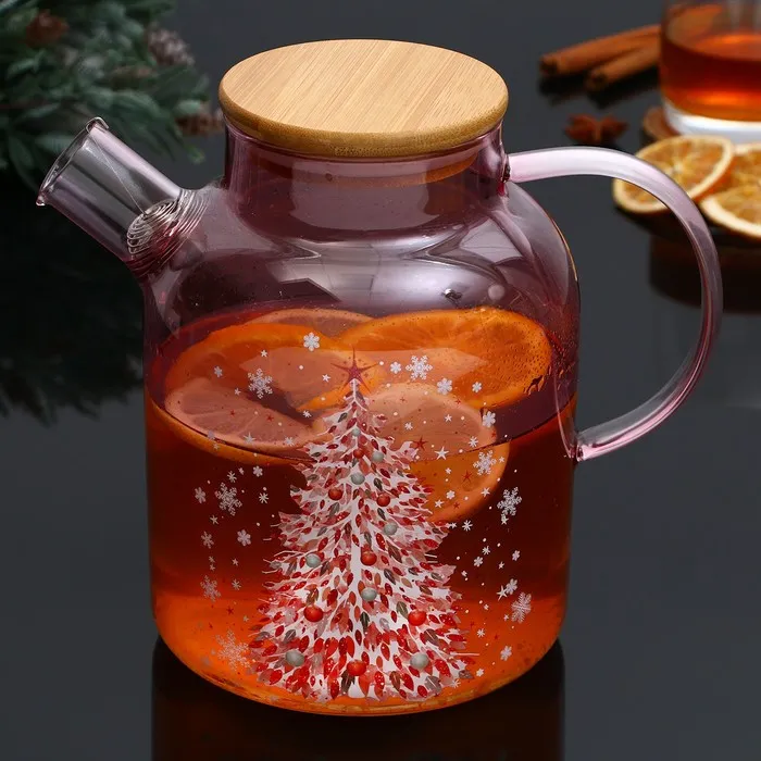 Новогодний стеклянный заварочный чайник с бамбуковой крышкой и объёмом 1700 мл — это стильный и функциональный аксессуар для вашей кухни.