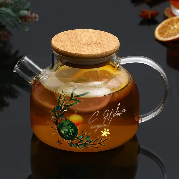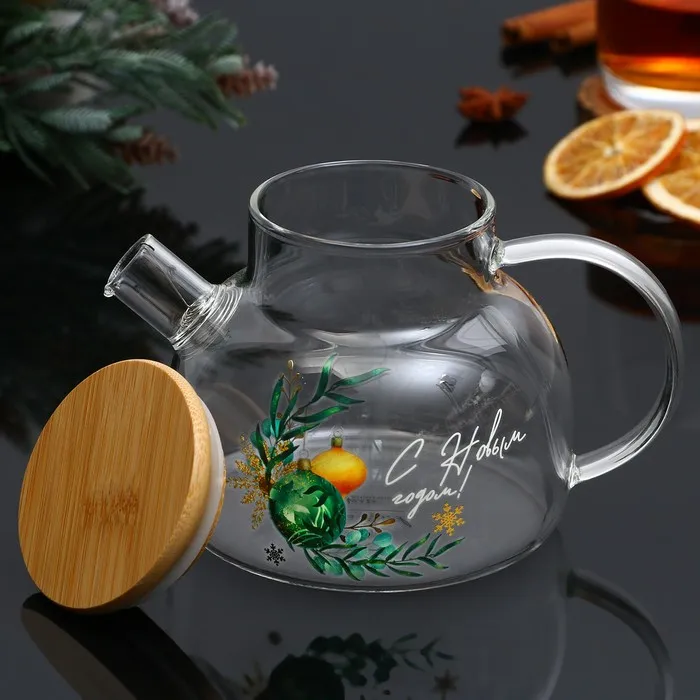 Новогодний стеклянный заварочный чайник с бамбуковой крышкой и объёмом 600 мл — это стильный и функциональный аксессуар для вашей кухни.