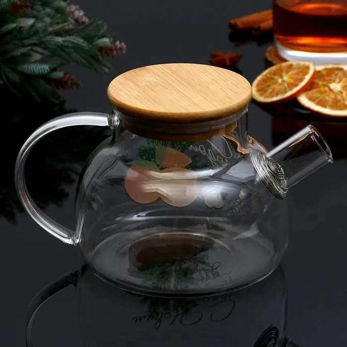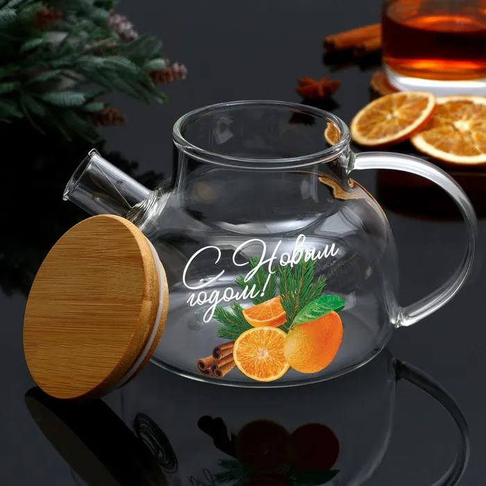 Новогодний стеклянный заварочный чайник с бамбуковой крышкой и объёмом 800 мл — это стильный и функциональный аксессуар для вашей кухни.