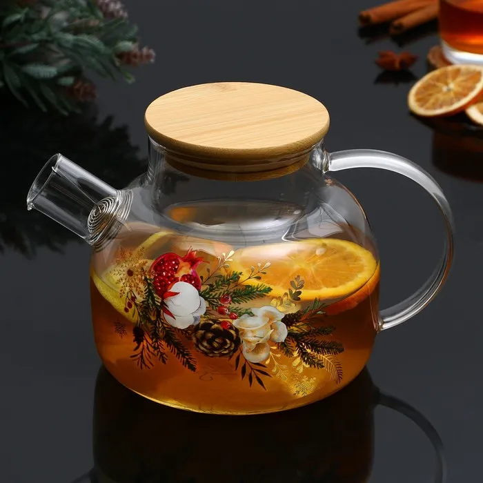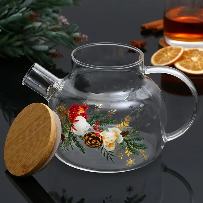 Новогодний стеклянный заварочный чайник с бамбуковой крышкой и объёмом 1000 мл — это стильный и функциональный аксессуар для вашей кухни.
