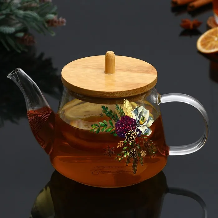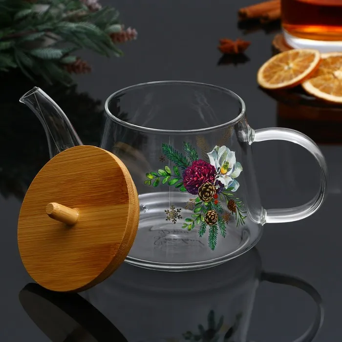 Новогодний стеклянный заварочный чайник с бамбуковой крышкой и объёмом 600 мл — это стильный и функциональный аксессуар для вашей кухни.