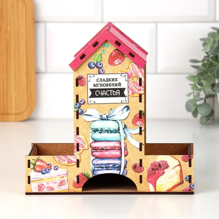 Чайный домик – это необычная упаковка для хранения чая. Он поможет навести порядок на обеденном столе, а также станет его яркой деталью. Чайные пакетики закладываются сверху внутрь домика и вынимаются снизу.