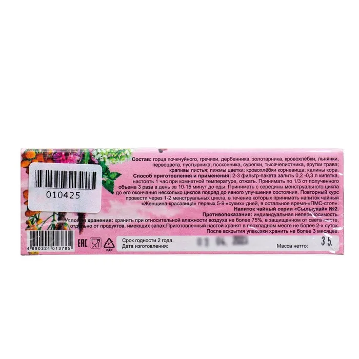 Рекомендован при доброкачественных новообразованиях матки (субсерозных, интрамуральных, субмукозных миом и фибромиом матки), гиперплазии эндометрия, эндометриозах, варикозных расширениях сосудов тела матки, при обильных менструациях и маточных кровотечениях. Обладает маткосокращающим, сосудоукрепляющим, кровоостанавливающим, противовоспалительным действием. Минимальный курс приема: повторный курс провести через 1-2 менструальных цикла, в течение которых принимать чайный напиток «Женщина-красавица» 5-9 «сухих» дней, в остальное время - «ПМС-стоп».