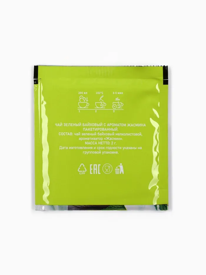 Состав: чай зелёный байховый мелколистовой, ароматизатор – жасмин