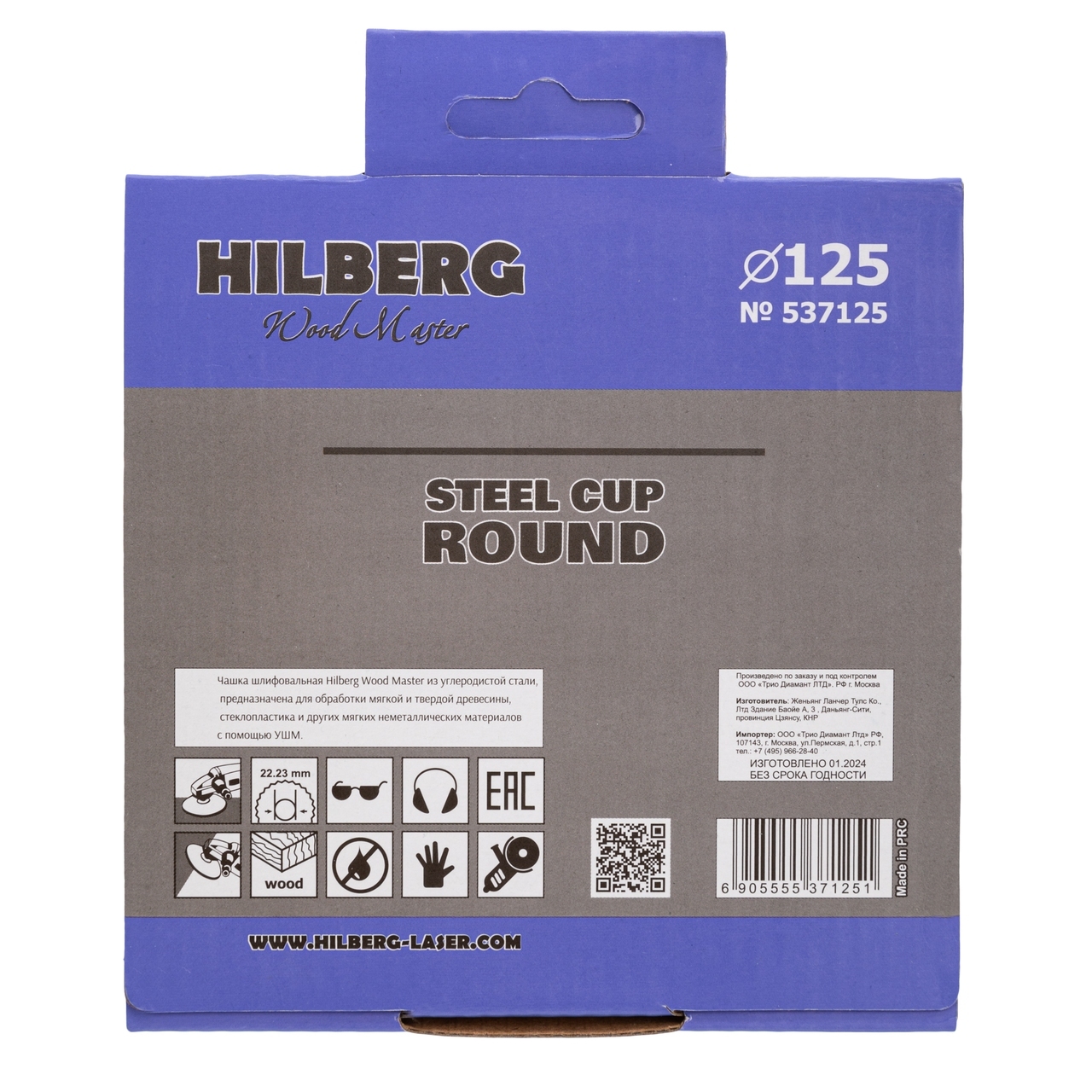 Шлифовальная чашка Hilberg Wood Master имеет сплошную круглую рабочую кромку, что обеспечивает равномерное снятие материала без излишней нагрузки на инструмент. Диаметр чашки составляет 125 мм, а посадочный — 22,23 мм, что делает её совместимой с большинством УШМ.