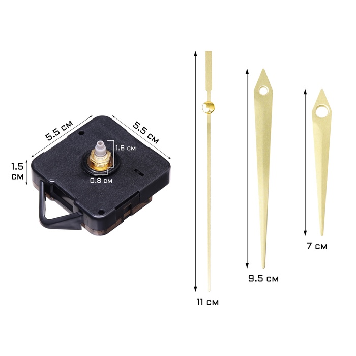 Часовой механизм со стрелками «Соломон-5», плавный ход, шток 16 мм, стрелки 58/84/85 мм, золотистые — Характеристики