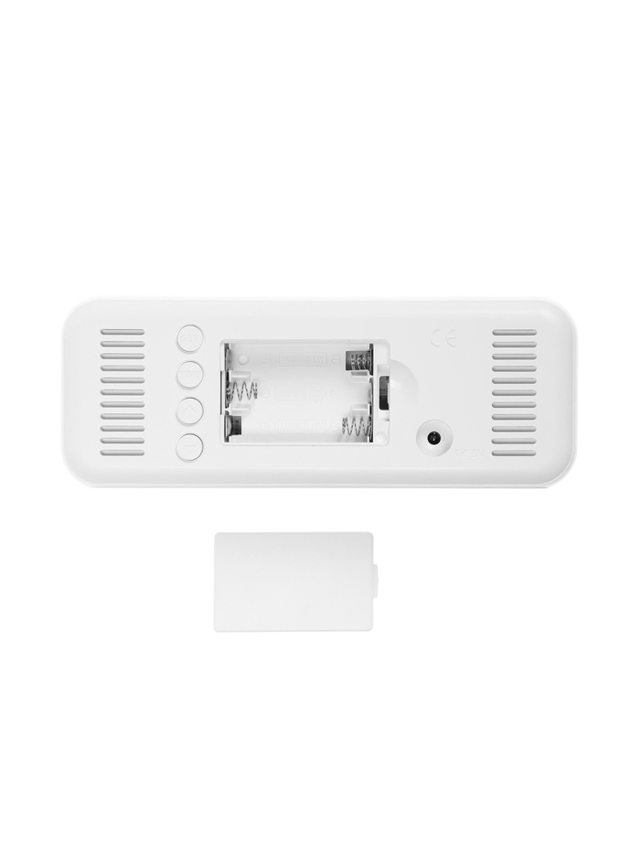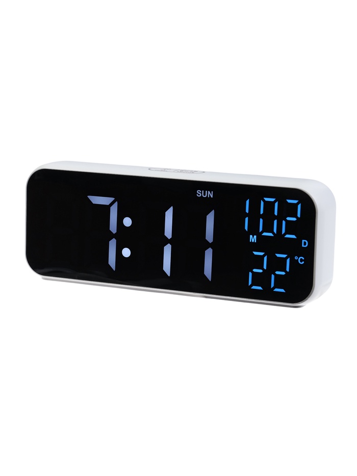 Компактный дизайн с белым и чёрным сочетанием гармонично вписывается в современные интерьеры, где синяя подсветка дополняет календарь для планирования дней, термометр для контроля климата и таймер сна для комфортного засыпания — идеально для рабочего стола или спальни.