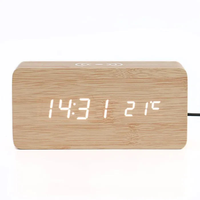 Часы настольные электронные из МДФ с будильником, тремометром и с возможностью беспроводной зарядки телефона и другой электроники представлены в современном дизайне с имитацией натурального дерева. Интерьерные часы станут прекрасным декором для дома и дачи, их можно поставить как на прикроватную тумбочку в спальне, детской комнате, гостиной так и на стол или на комод в зале, холле или на кухне. Часы настольные обладают громким будильником, ребенку и вам будет комфортно просыпаться, на работу и в школу. Будильник не требует частой замены батареек благодаря экономичному механизму.