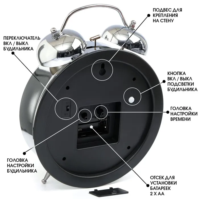 Часы с будильником представлены в ретро дизайне, они отлично впишутся в ваш интерьер. Интерьерные часы станут прекрасным декором для дома и дачи, их можно поставить как на прикроватную тумбочку в спальне, детской комнате, гостиной так и на стол или на комод в зале, холле или на кухне. Будильник настольный имеет кварцевый механизм, который гарантирует высокую точность хода. Часы настольные обладают громким будильником, ребенку и вам будет комфортно просыпаться, на работу и в школу. Будильник на батарейках не требует частой замены батареек благодаря экономичному механизму.