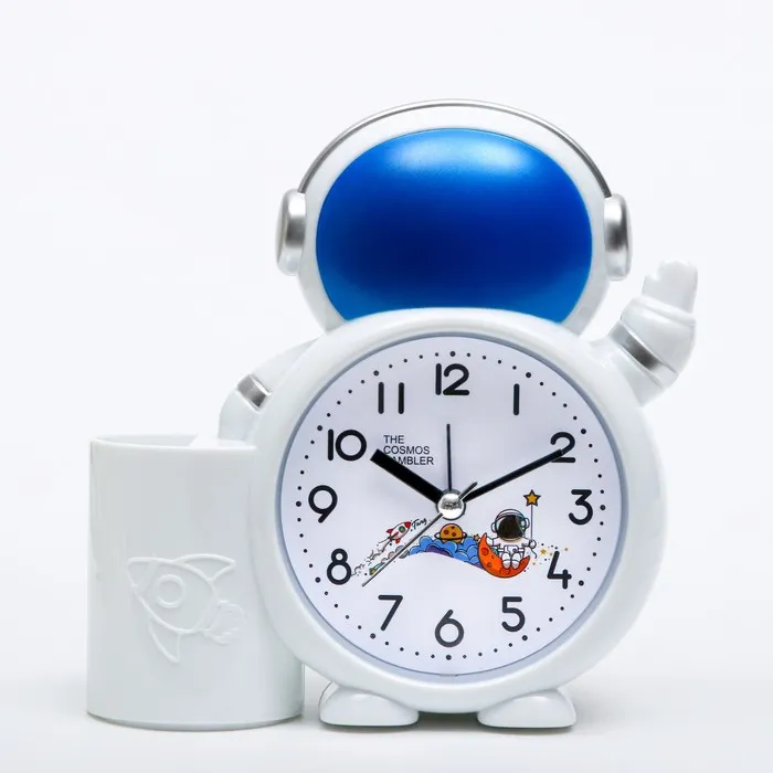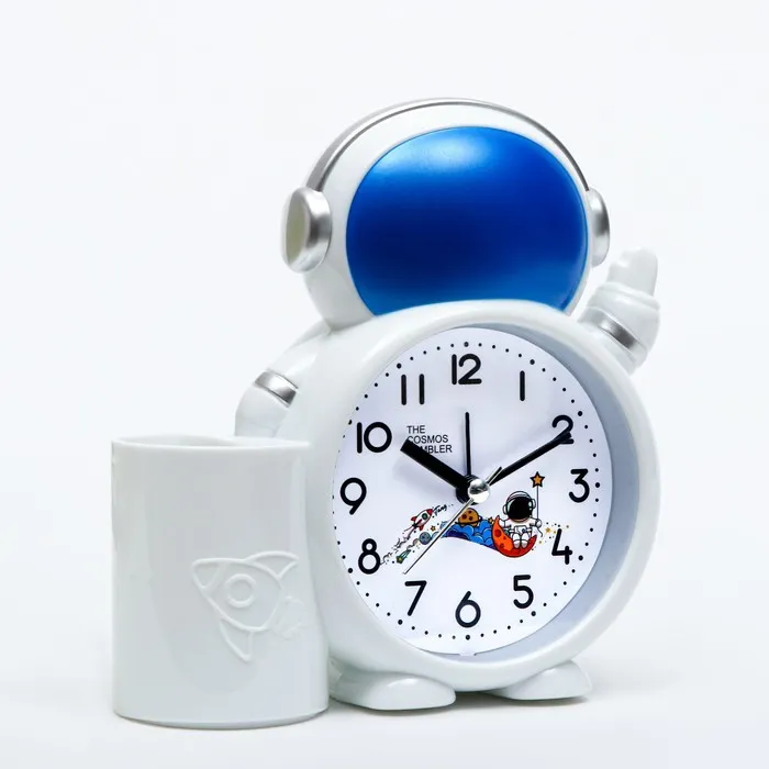 Часы с будильником представлены в оригинальном дизайне в форме космонавта, они отлично впишутся в интерьер. Интерьерные часы станут прекрасным декором для дома и дачи, их можно поставить как на прикроватную тумбочку в спальне, детской комнате, гостиной так и на стол или на комод в зале, холле или на кухне. Будильник настольный имеет кварцевый механизм, который гарантирует высокую точность хода. Часы настольные обладают громким будильником, ребенку и вам будет комфортно просыпаться, на работу и в школу. Будильник на батарейках не требует частой замены батареек благодаря экономичному механизму.