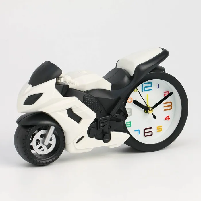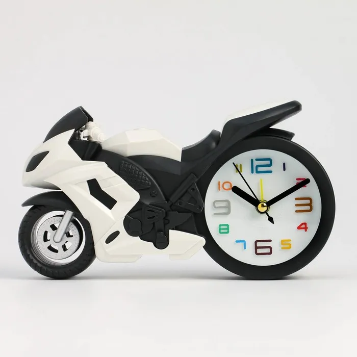 Часы с будильником представлены в оригинальном дизайне в форме спортивного мотоцикла, они отлично впишутся в интерьер. Интерьерные часы станут прекрасным декором для дома и дачи, их можно поставить как на прикроватную тумбочку в спальне, детской комнате, гостиной так и на стол или на комод в зале, холле или на кухне. Будильник настольный имеет кварцевый механизм, который гарантирует высокую точность хода. Часы настольные обладают громким будильником, ребенку и вам будет комфортно просыпаться, на работу и в школу. Будильник на батарейках не требует частой замены батареек благодаря экономичному механизму.