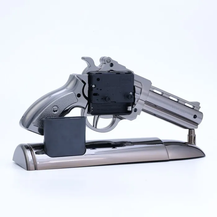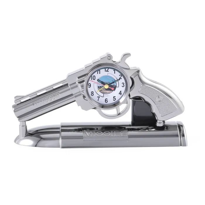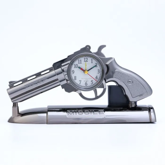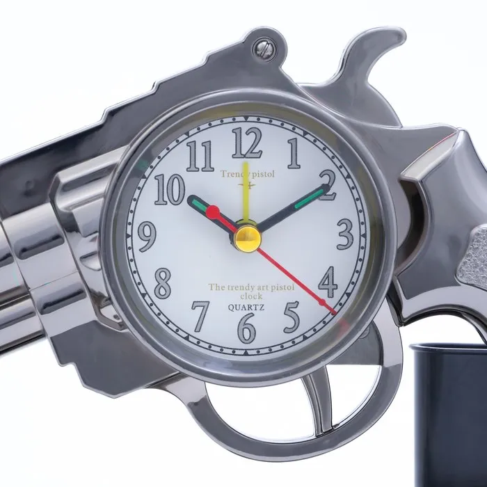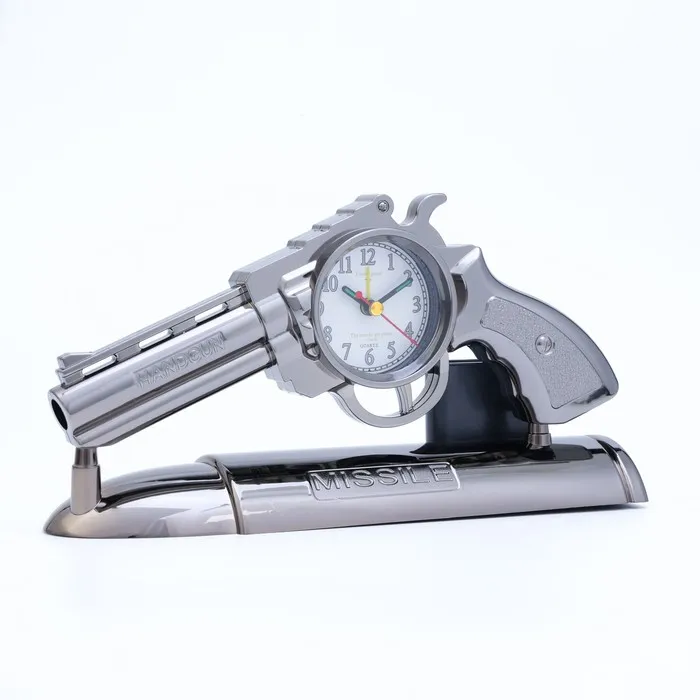 Часы с будильником представлены в оригинальном дизайне в форме револьвера, они отлично впишутся в интерьер. Интерьерные часы станут прекрасным декором для дома и дачи, их можно поставить как на прикроватную тумбочку в спальне, детской комнате, гостиной так и на стол или на комод в зале, холле или на кухне. Будильник настольный имеет кварцевый механизм, который гарантирует высокую точность хода. Часы настольные обладают громким будильником, ребенку и вам будет комфортно просыпаться, на работу и в школу. Будильник на батарейках не требует частой замены батареек благодаря экономичному механизму.