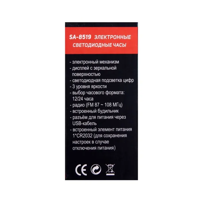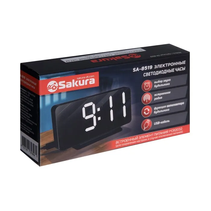 Часы-будильник Sakura SA-8519, электронные, будильник, радио, 1хCR2032, чёрные — Характеристики