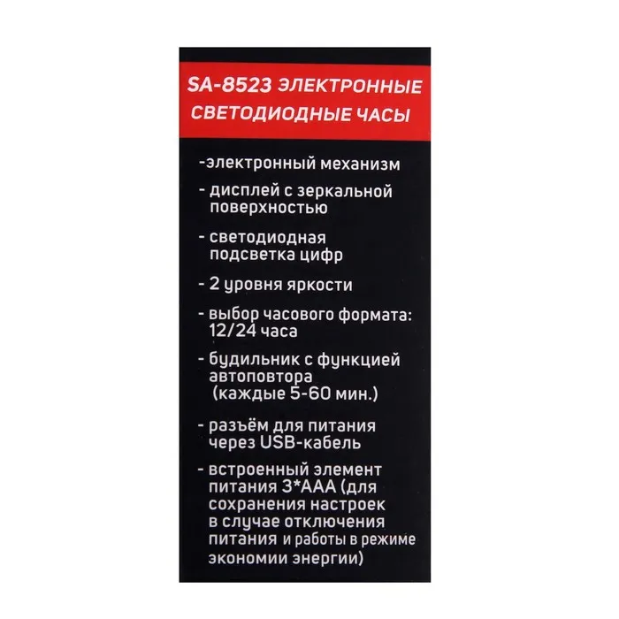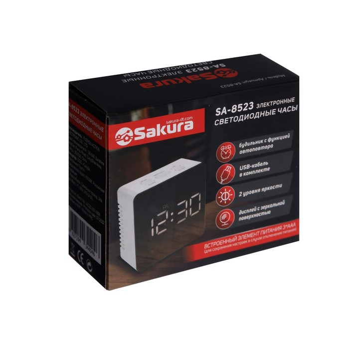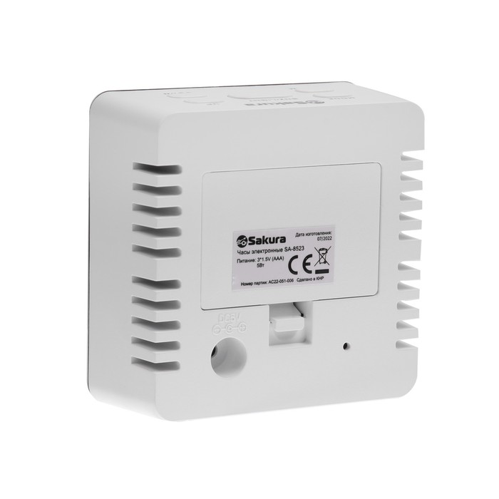 Часы-будильник Sakura SA-8523, электронные, будильник, 3хААА, белые — Характеристики