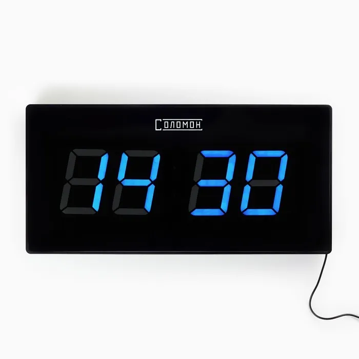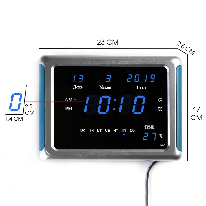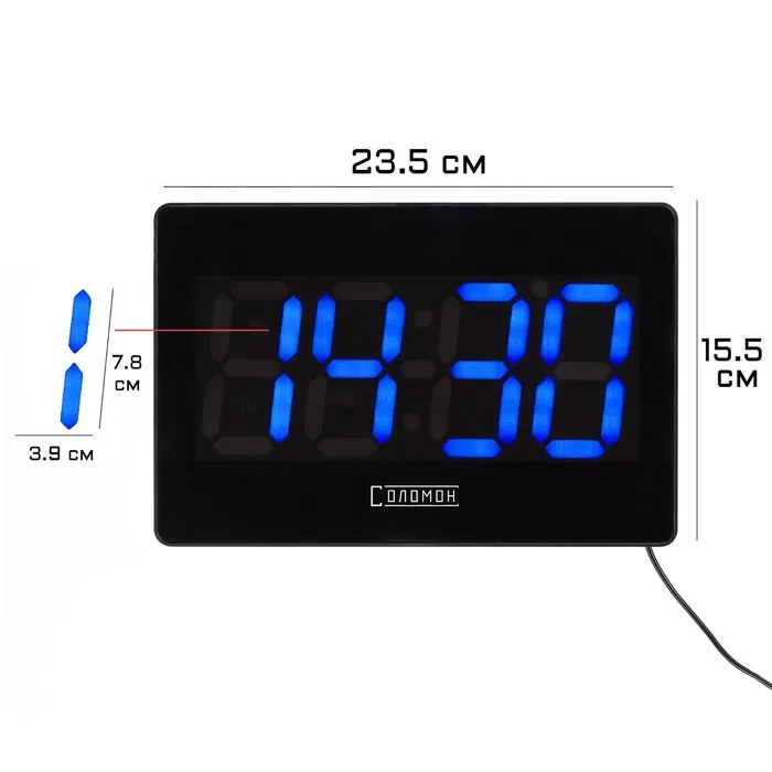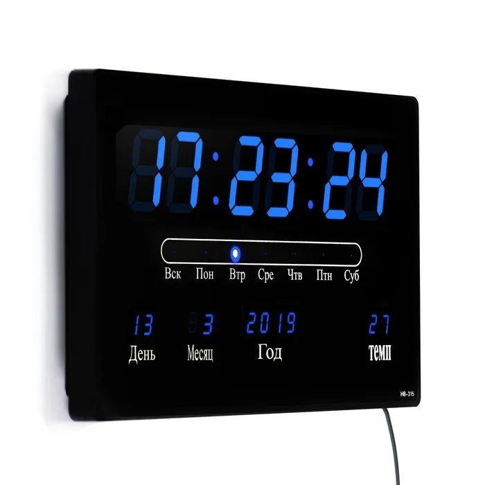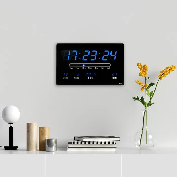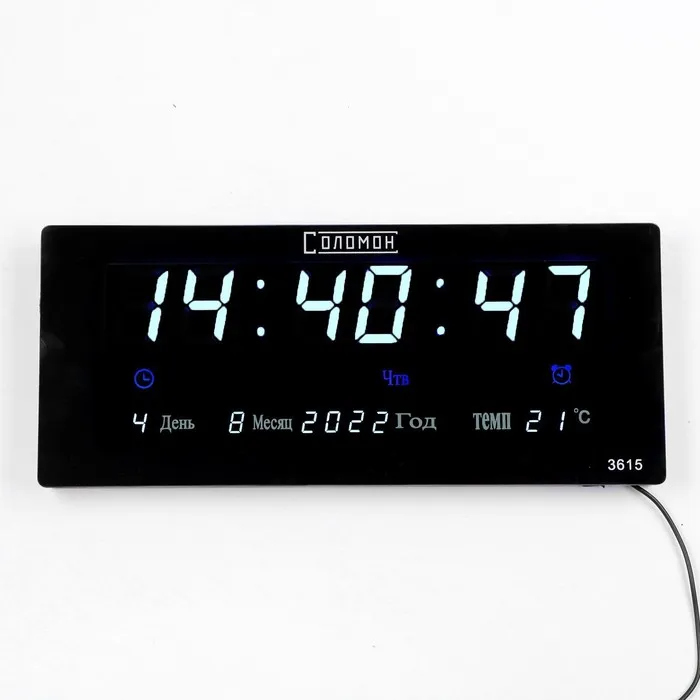 Часы электронные настенные, будильник, календарь, термометр, 20 х 3 х 33 см, синяя индикация, черные — Характеристики
