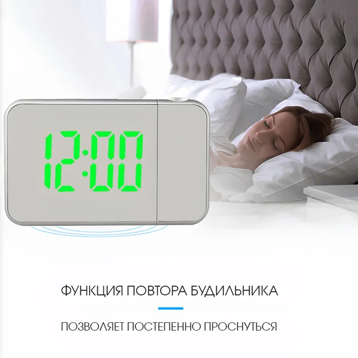 Часы настольные электронные с будильником, гигрометром, календарем и возможностью проецировать время на стену или потолок представлены в современном минималистичном дизайне. Интерьерные часы станут прекрасным декором для дома и дачи, их можно поставить как на прикроватную тумбочку в спальне, детской комнате, гостиной так и на стол или на комод в зале, холле или на кухне. Часы настольные обладают громким будильником, ребенку и вам будет комфортно просыпаться, на работу и в школу. Будильник не требует частой замены батареек благодаря экономичному механизму.