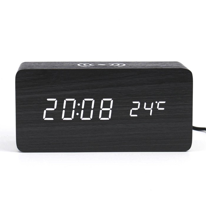 Часы настольные электронные из МДФ с будильником, тремометром и с возможностью беспроводной зарядки телефона и другой электроники представлены в современном дизайне с имитацией натурального дерева. Интерьерные часы станут прекрасным декором для дома и дачи, их можно поставить как на прикроватную тумбочку в спальне, детской комнате, гостиной так и на стол или на комод в зале, холле или на кухне. Часы настольные обладают громким будильником, ребенку и вам будет комфортно просыпаться, на работу и в школу. Будильник не требует частой замены батареек благодаря экономичному механизму.