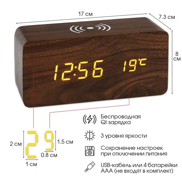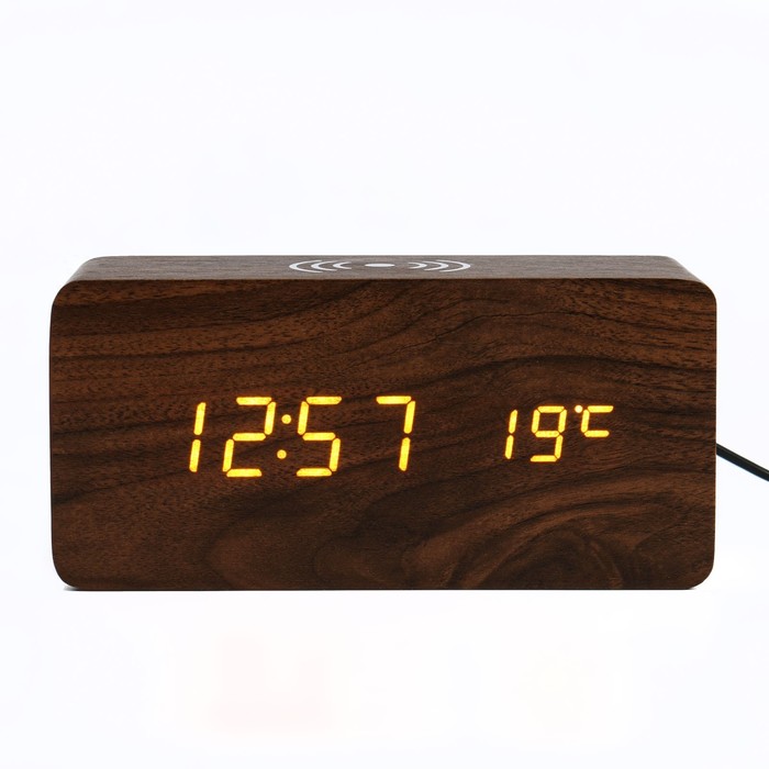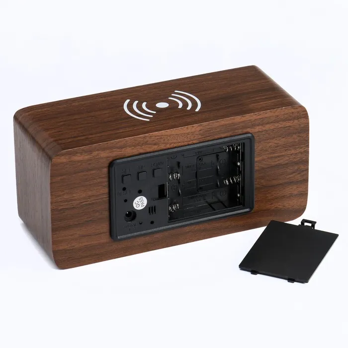 Часы настольные электронные из МДФ с будильником, тремометром и с возможностью беспроводной зарядки телефона и другой электроники представлены в современном дизайне с имитацией натурального дерева. Интерьерные часы станут прекрасным декором для дома и дачи, их можно поставить как на прикроватную тумбочку в спальне, детской комнате, гостиной так и на стол или на комод в зале, холле или на кухне. Часы настольные обладают громким будильником, ребенку и вам будет комфортно просыпаться, на работу и в школу. Будильник не требует частой замены батареек благодаря экономичному механизму.