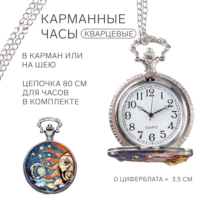 Часы карманные "Солнце", кварцевые, циферблата d=3.5 см, цепочка 80 см — Характеристики