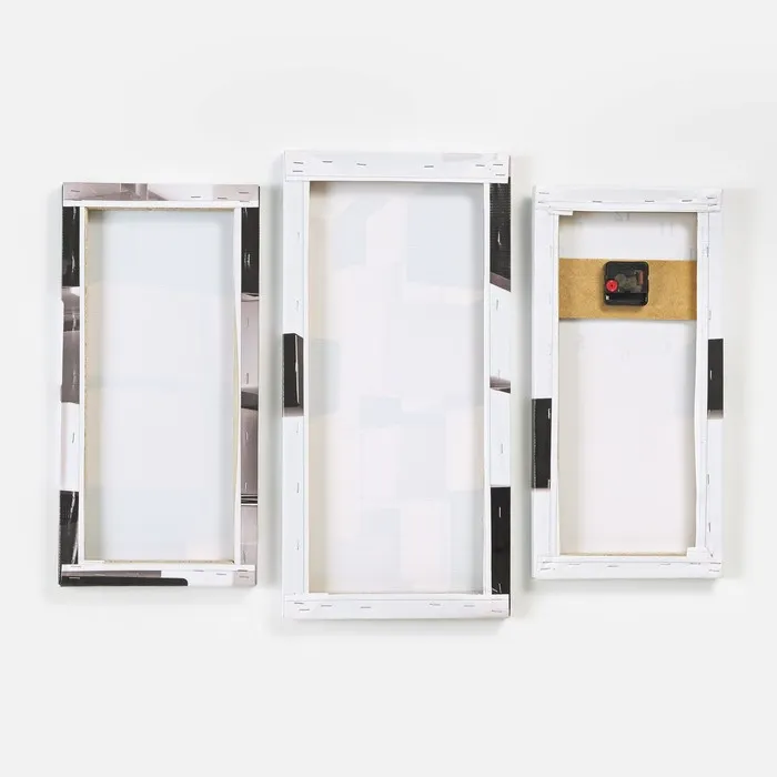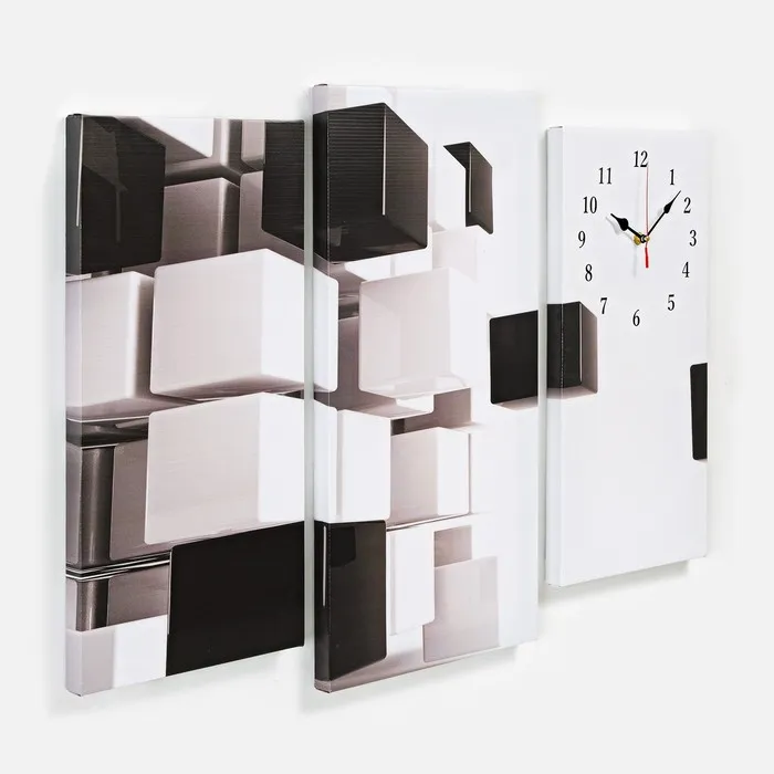 Часы выполнены на холсте, который не выцветает на солнце, не деформируется под влиянием повышенной влажности или перепадов температуры. Подрамник выполнен из МДФ - крепкого, экологически чистого материала. Качество сборки препятствует провисанию полотна со временем. Упакован в картонную коробку. У часов простая система креплений. Рекомендуемое расстояние между модулями 1-2 см. Без стекла. Механизм бесшумный, батарейка формата АА в комплект не входит. Тип индикации - арабские цифры, что делает время на часах четко видимым и легко читаемым.