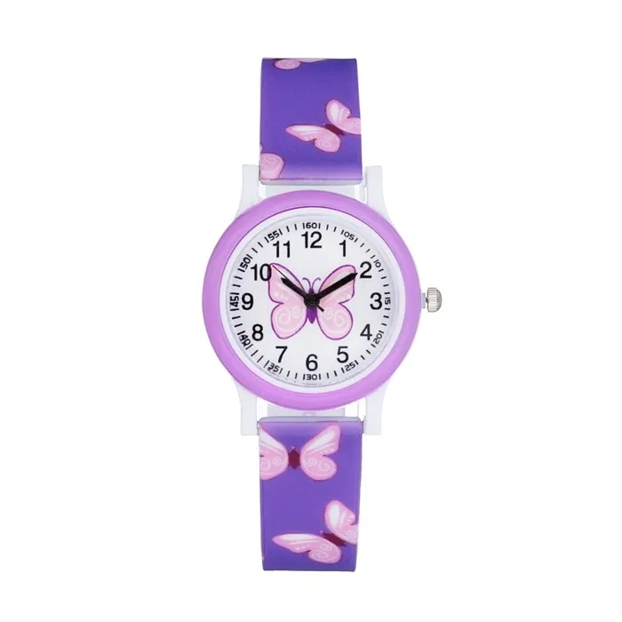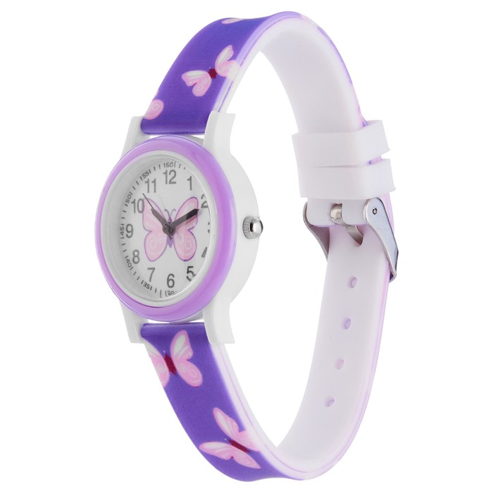 Яркие детские наручные часы - модный аксессуар для девочек с важным функциональным предназначением. Благодаря наличию такого типа часов ребенок научится распознавать время и планировать свои дела. Циферблат на фоне бабочек однозначно заинтересует любую девочку.