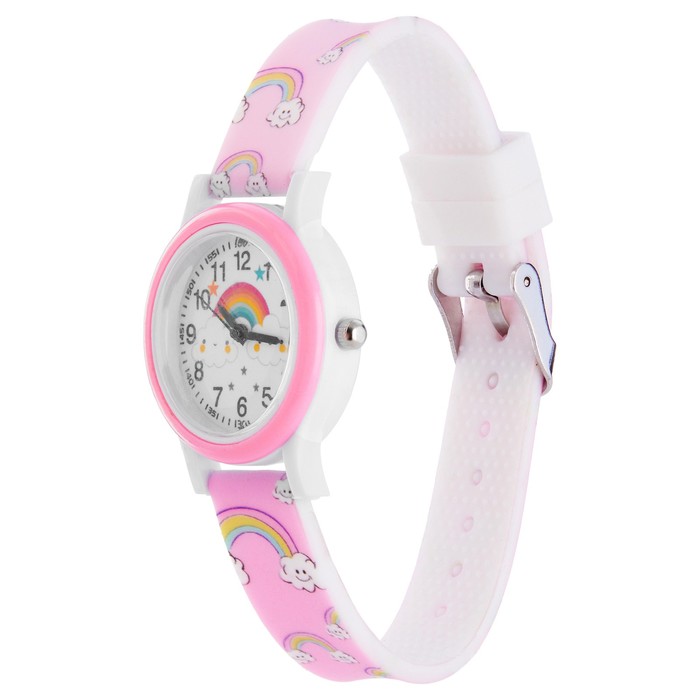 Яркие детские наручные часы - модный аксессуар для девочек с важным функциональным предназначением. Благодаря наличию такого типа часов ребенок научится распознавать время и планировать свои дела. Часы с рисунком облаков с радугой однозначно заинтересуют любую девочку.