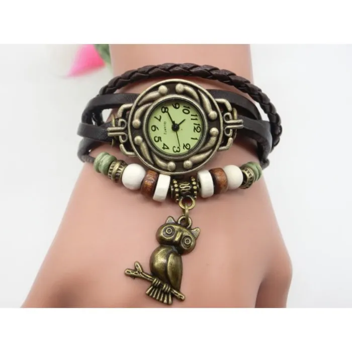 Утонченный и изящный дизайн наручных часов подчеркнет ваш безукоризненный вкус в любой ситуации и дополнит образ. Красивые винтажные часы с подвеской на кожаном плетёном ремешке для прекрасных дам любого возраста. Работают от батарейки типа "таблетка", которой хватает на долгое время. Ремешок украшен деревянными бусами и акрилом.