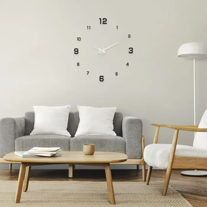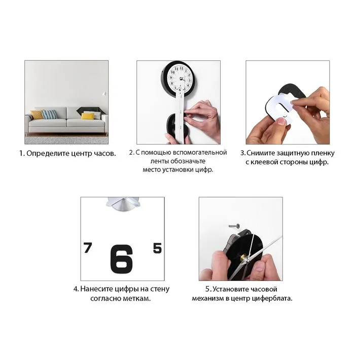Оригинальные часы-наклейка имеют липкий слой, который позволяет разместить их на любой поверхности: обоях, дереве, пластике, керамике или металле. В комплект входит шаблон. С его помощью вы выберете нужный диаметр часов и сделаете отметки на стене, чтобы приклеить элементы.