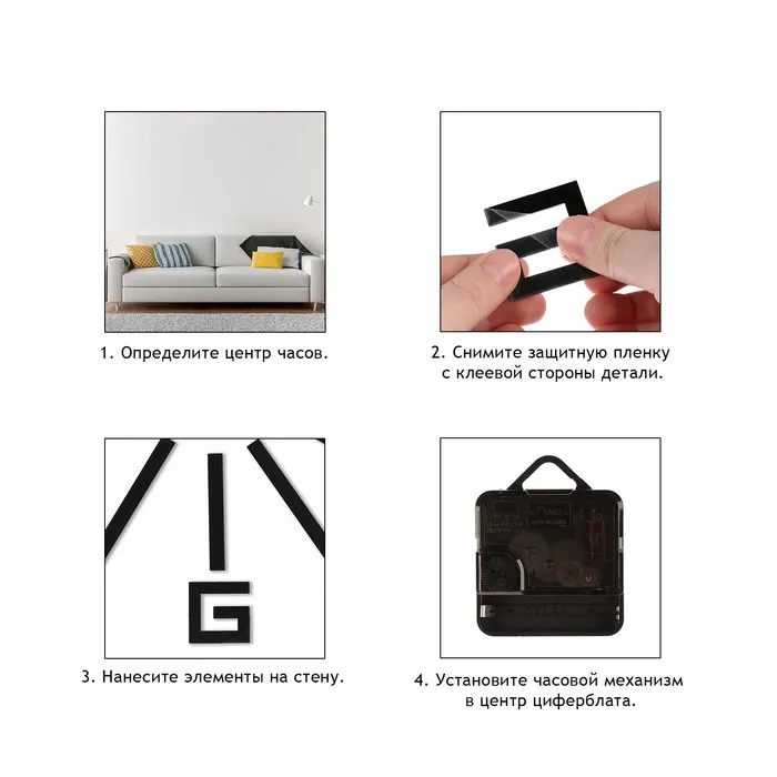 • Создавайте часы в собственном стиле, проявляйте изобретательность и креативность. Не обязательно располагать числа по кругу — придайте аксессуару необычную форму, поменяйте диаметр циферблата, используйте не все элементы. Комплектующие легко клеятся на стену и без труда снимаются.