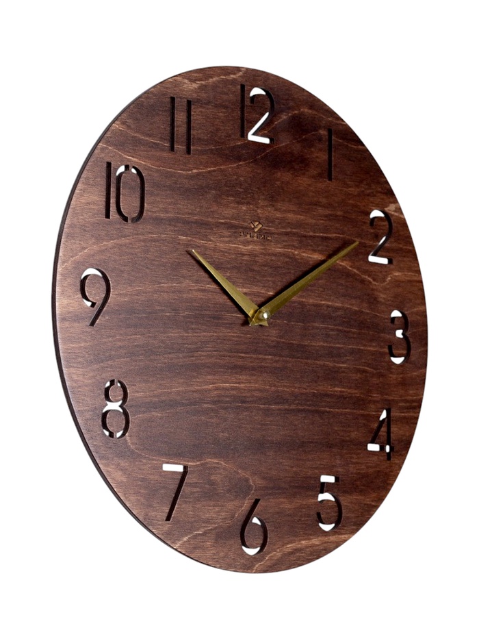 Настенные часы диаметром 35 см, выполненные из натурального дерева в тёплом коричневом оттенке, станут лаконичным и функциональным дополнением интерьера. Благодаря бесшумному кварцевому механизму и плавному ходу стрелок устройство практически не слышно даже в тихой спальне или кабинете.