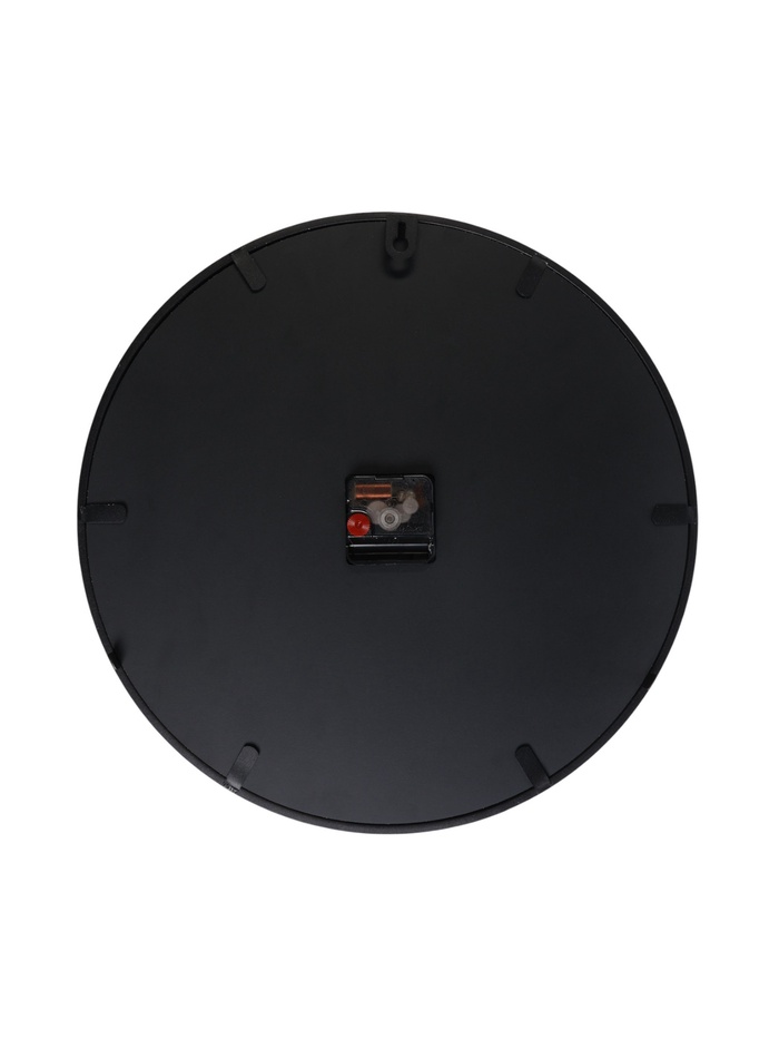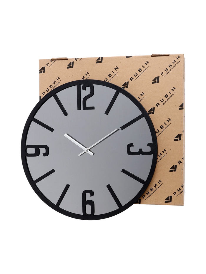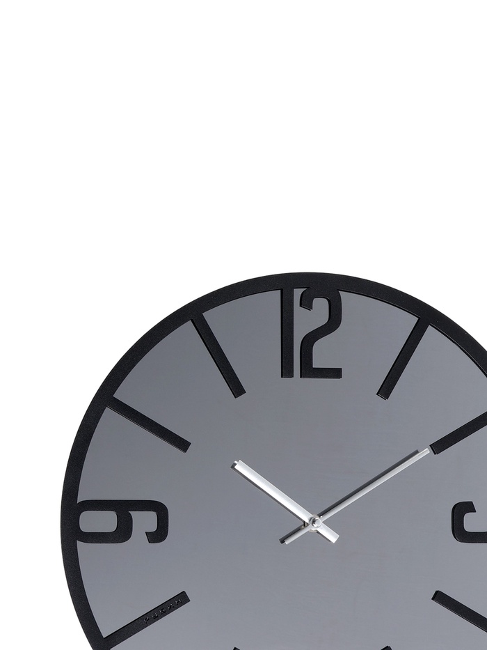 Чёрный корпус смотрится лаконично и современно, а отражающая поверхность добавляет глубины пространству и визуально увеличивает комнату. Арабские цифры и отметки на циферблате позволяют мгновенно считать время с любого ракурса, и часы становятся не просто функциональным элементом, а выразительным акцентом оформления.