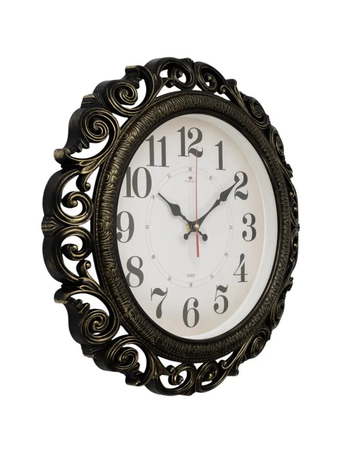 Диаметр корпуса составляет 40,5 см, что позволяет легко читать время со значительного расстояния. Их корпус украшен ажурным узором, который придает часам оригинальный и изысканный вид. Однако, самым важным преимуществом этих интерьерных часов является бесшумный механизм, который обеспечивает равномерный ход стрелок без каких-либо шумов. Это отличное решение для тех, кто ценит тишину в доме и хочет, чтобы звуковые эффекты часов не мешали покою. Кроме того, плавный ход стрелок делает чтение времени еще более легким и удобным.