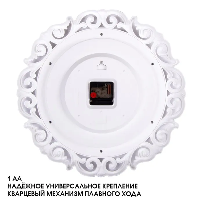 Диаметр корпуса составляет 40,5 см, что позволяет легко читать время со значительного расстояния. Их корпус украшен ажурным узором, который придает часам оригинальный и изысканный вид. Однако, самым важным преимуществом этих интерьерных часов является бесшумный механизм, который обеспечивает равномерный ход стрелок без каких-либо шумов. Это отличное решение для тех, кто ценит тишину в доме и хочет, чтобы звуковые эффекты часов не мешали покою. Кроме того, плавный ход стрелок делает чтение времени еще более легким и удобным.