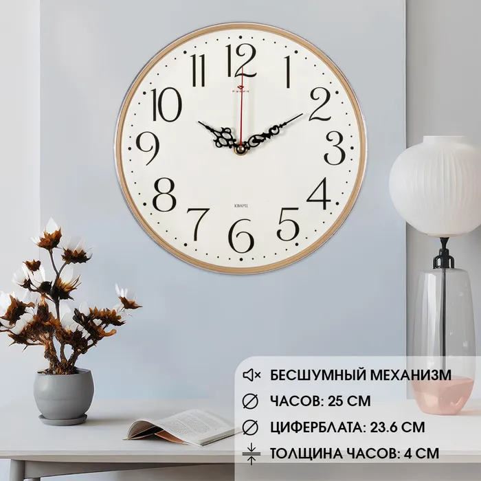 Часы настенные классические, бесшумные, плавный ход, d=25 см, стекло, от батарейки 1×АА — Характеристики