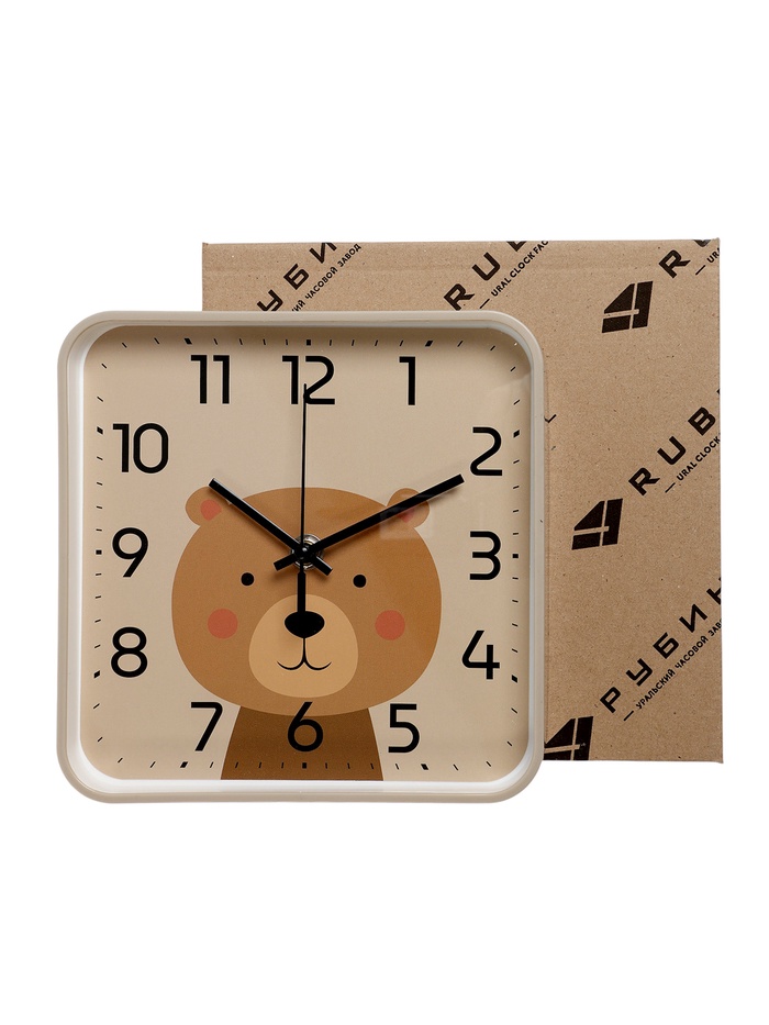 Квадратные настенные часы размером 19×19 см с изображением милого медвежонка на бежевом фоне воплощают нежность и игривость, идеально подходя для детских комнат или игровых зон. Кварцевый механизм обеспечивает плавный ход стрелок, а арабские цифры на циферблате делают отсчёт времени интуитивно понятным, помогая развивать чувство времени у малышей с раннего возраста.