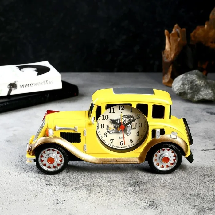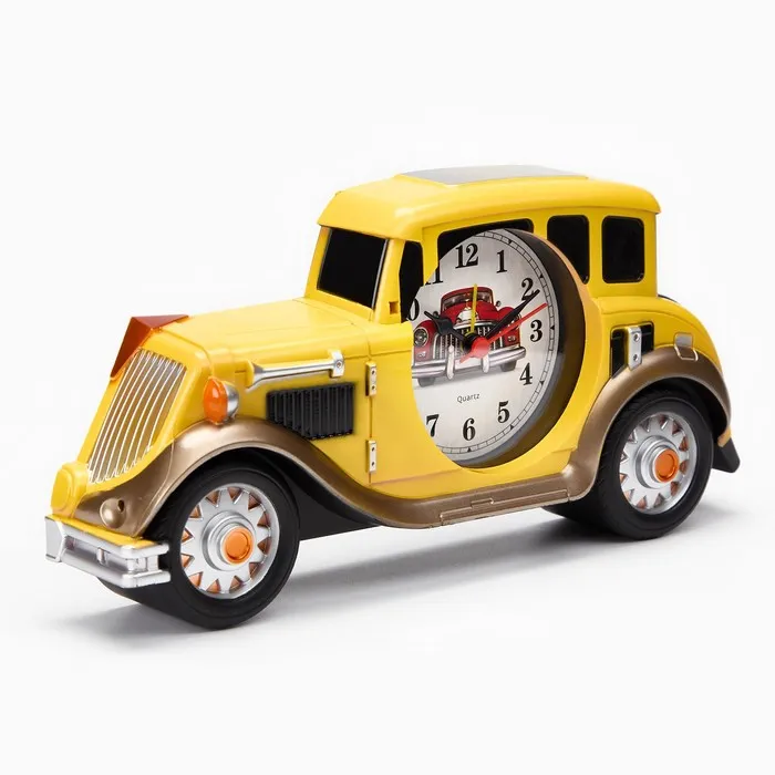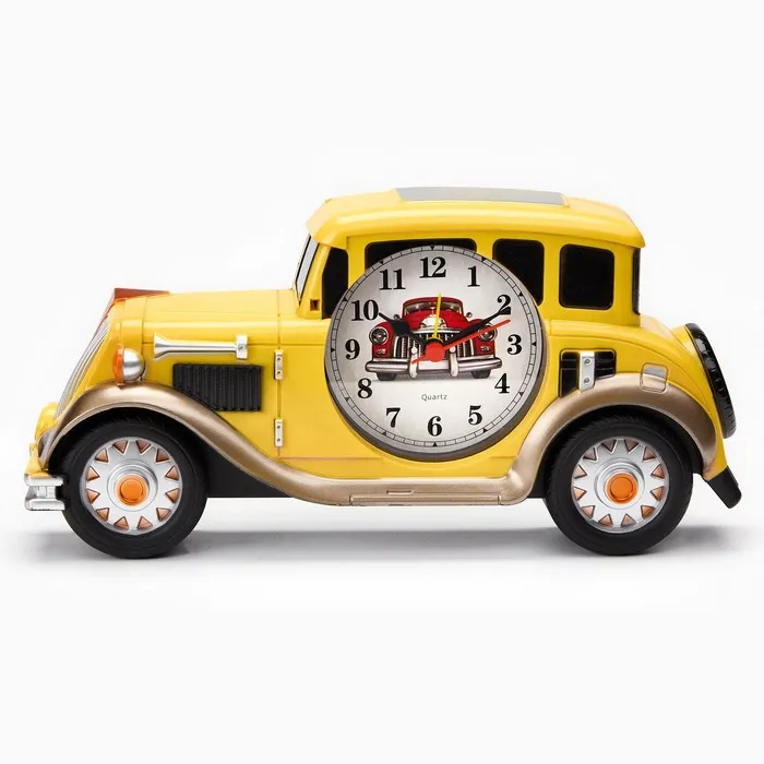 Часы с будильником представлены в ретро дизайне в форме автомобиля, они отлично впишутся в ваш интерьер. Интерьерные часы станут прекрасным декором для дома и дачи, их можно поставить как на прикроватную тумбочку в спальне, детской комнате, гостиной так и на стол или на комод в зале, холле или на кухне. Будильник настольный имеет кварцевый механизм, который гарантирует высокую точность хода. Часы настольные обладают громким будильником, ребенку и вам будет комфортно просыпаться, на работу и в школу. Будильник на батарейках не требует частой замены батареек благодаря экономичному механизму.