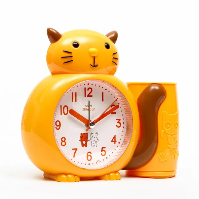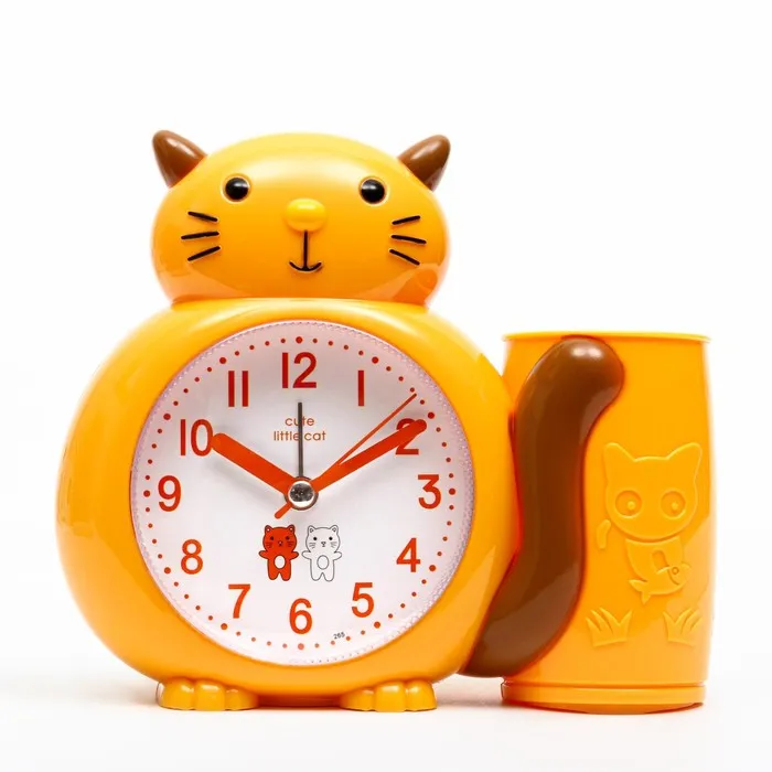 Часы - органайзер с будильником представлены в современном дизайне в форме котенка, они отлично впишутся в интерьер. Интерьерные часы станут прекрасным декором для дома и дачи, их можно поставить как на прикроватную тумбочку в спальне, детской комнате, гостиной так и на стол или на комод в зале, холле или на кухне. Будильник настольный имеет кварцевый механизм, который гарантирует высокую точность хода. Часы настольные обладают громким будильником, ребенку и вам будет комфортно просыпаться, на работу и в школу. Будильник на батарейках не требует частой замены батареек благодаря экономичному механизму. В карандашнице можно хранить канцелярские принадлежности: цветные карандаши, кисти, ручки, ножницы.