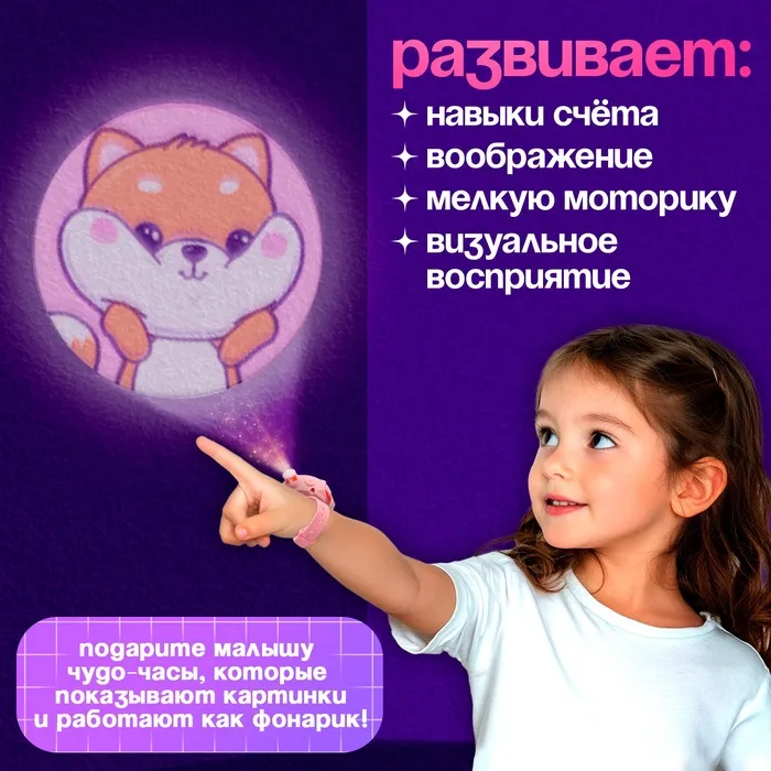 Часы-проектор «Милашки» показывают время и красочные картинки. Малышка научится правильно определять часы и минуты, а также поиграет со встроенным в устройство проектором.