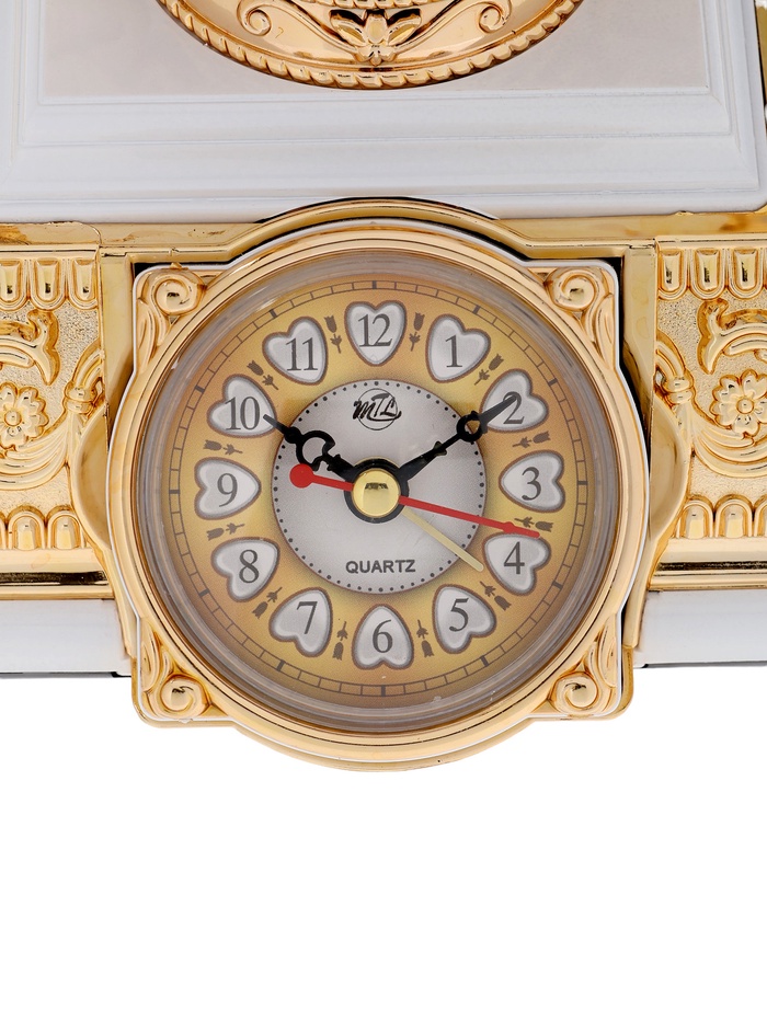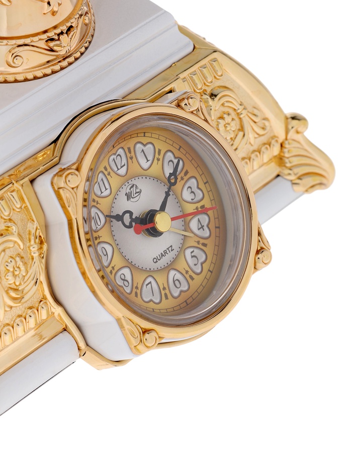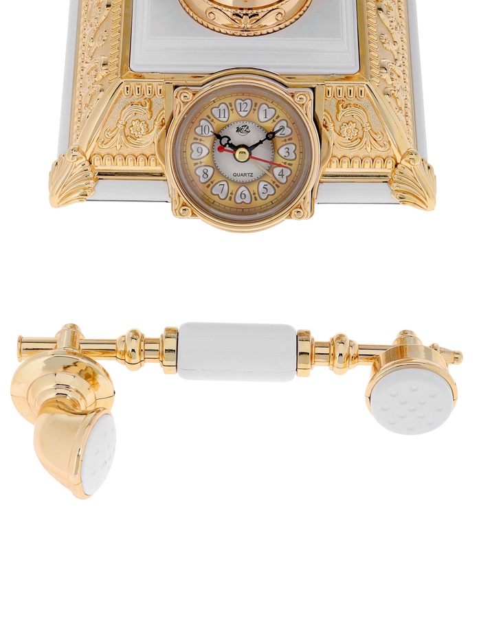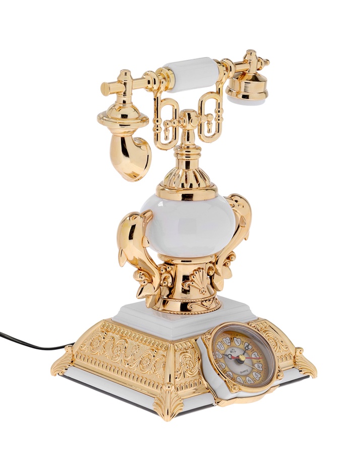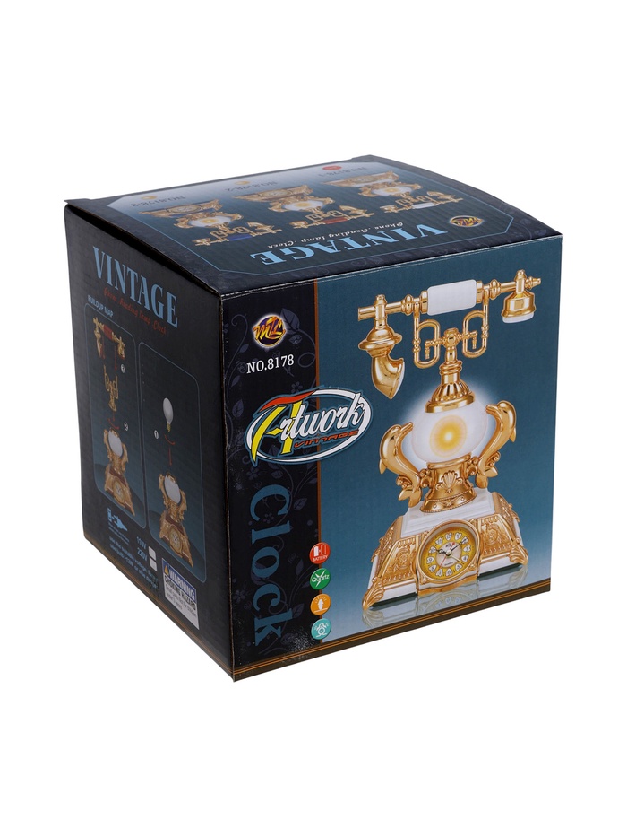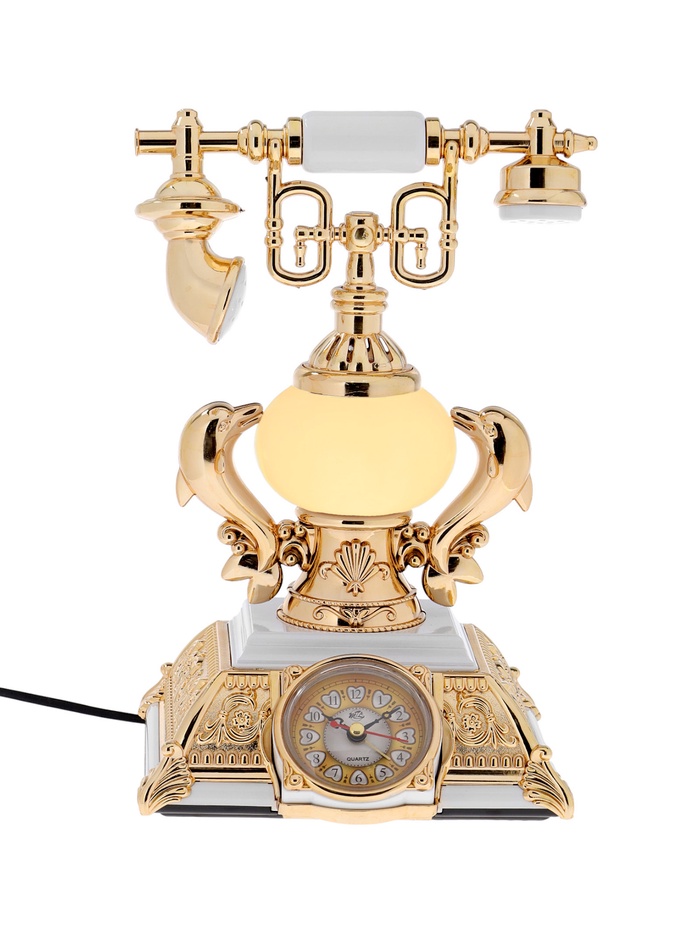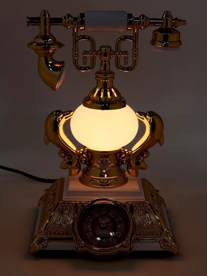 Этот настольный аксессуар в виде ретро-телефона соединяет в себе три функции: часы, будильник и светильник. Белый пластик корпуса с золотистыми вставками придаёт модели изысканный винтажный шарм, а аналоговый циферблат усиливает ощущение классики. Такое устройство станет ярким акцентом интерьера, одновременно эстетичным и практичным.