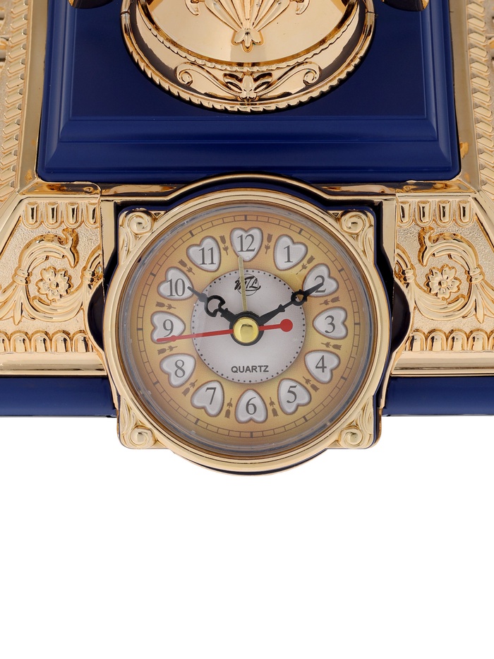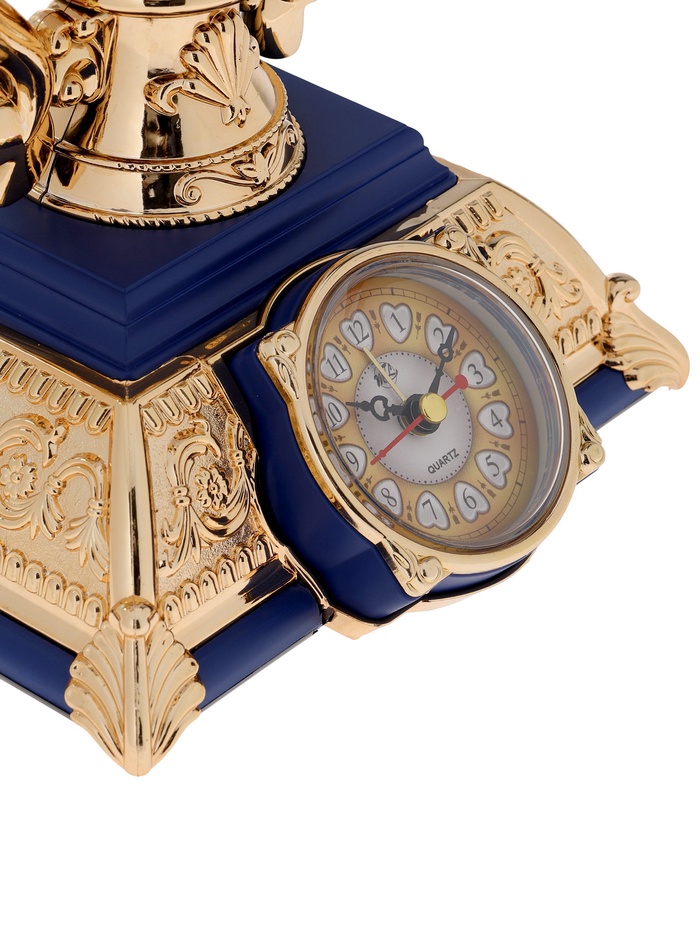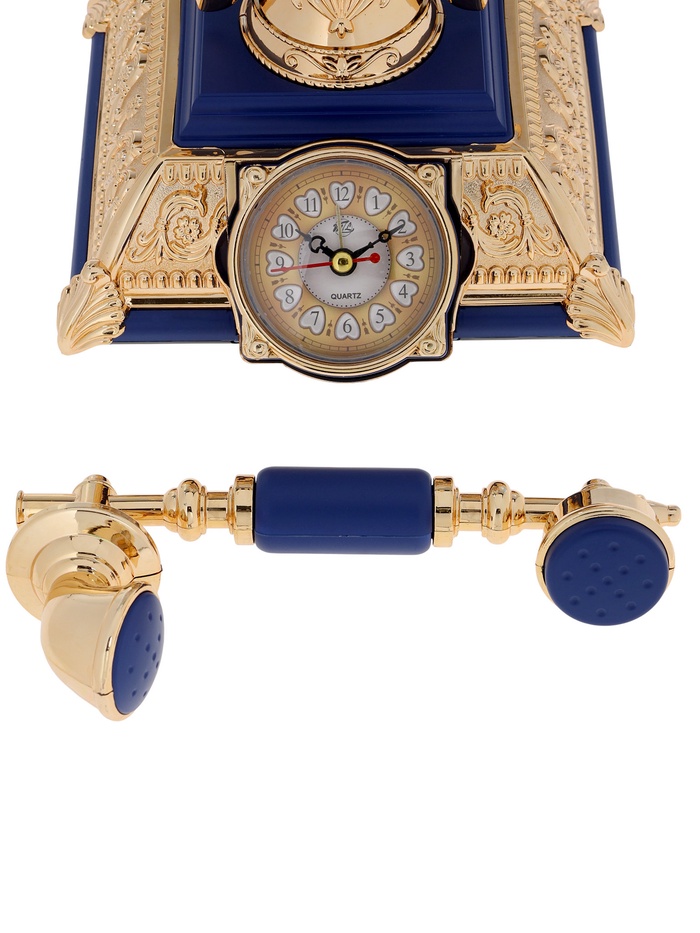Эта стильная настольная модель в образе ретро-телефона создаёт атмосферу уютной винтажной эстетики и одновременно выполняет функции часов, будильника и светильника. Глубокий синий оттенок корпуса в сочетании с золотистыми акцентами делает изделие ярким декоративным элементом, который легко вписывается как в классический интерьер, так и в современную комнату.