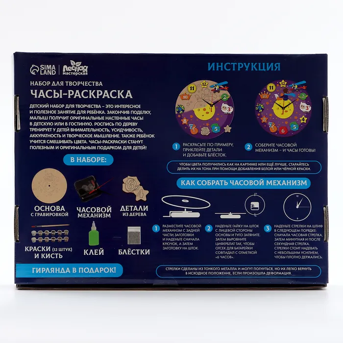 - Вы можете раскрасить детали часов по предложенной схеме на коробке или придумать свои уникальные цветовые сочетания.