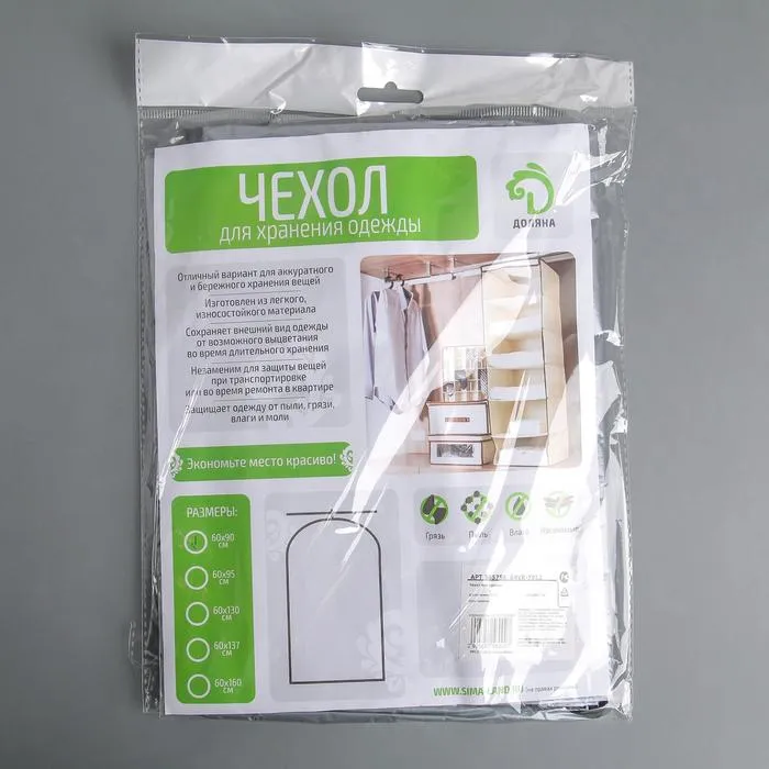 - Чехол надёжно защищает одежду от пыли и грязи, от насекомых, механических повреждений или от возможного выцветания.