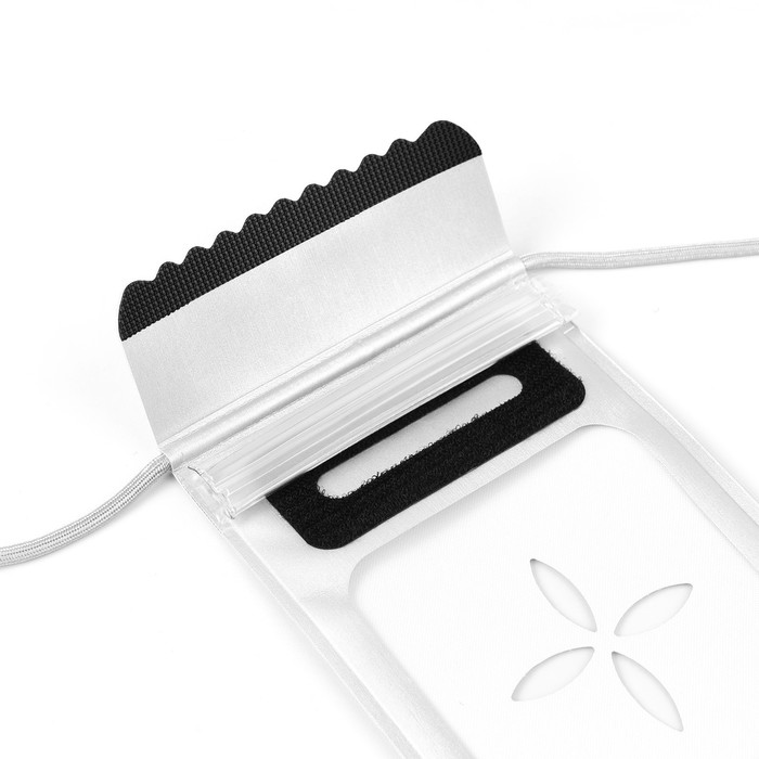 Чехол изготовлен из мягкого ПВХ и оснащена четырмя этапами защиты: три застежки типа zip lock и фиксация застежек в скрученном состоянии с помощью липучки - за счет этого обеспечивается защита содержимого от воды.
