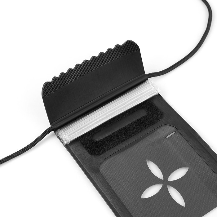 Чехол изготовлен из мягкого ПВХ и оснащена четырмя этапами защиты: три застежки типа zip lock и фиксация застежек в скрученном состоянии с помощью липучки - за счет этого обеспечивается защита содержимого от воды.