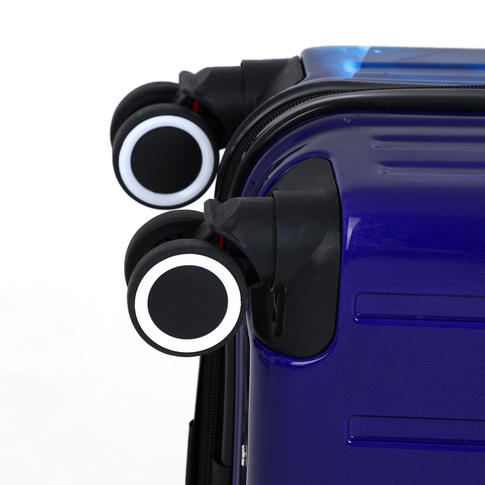 - Яркий синий цвет делает чемодан заметным среди багажа.