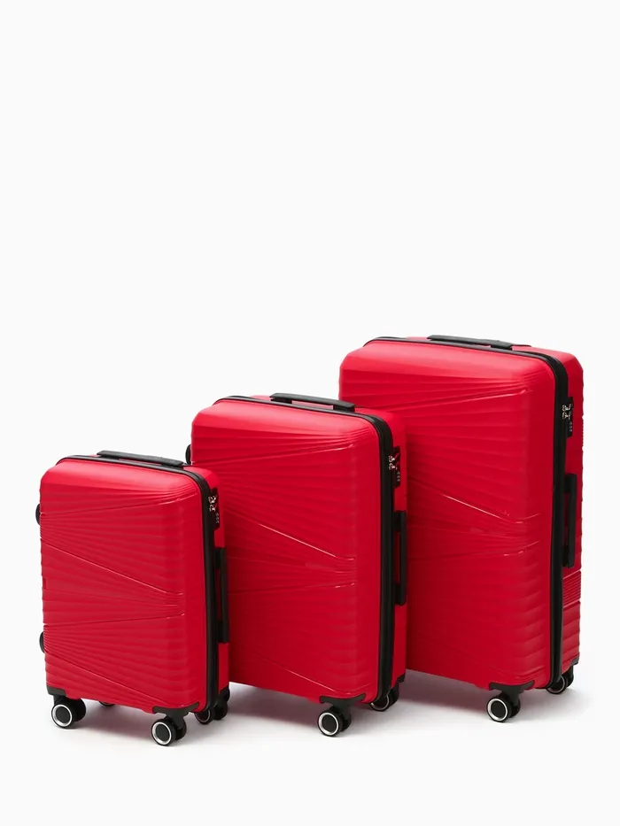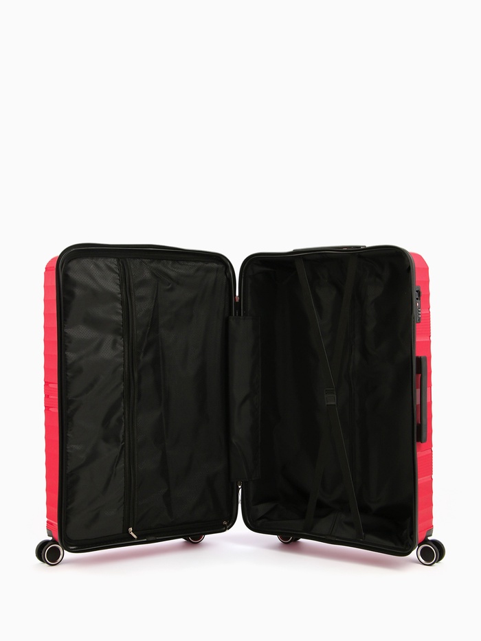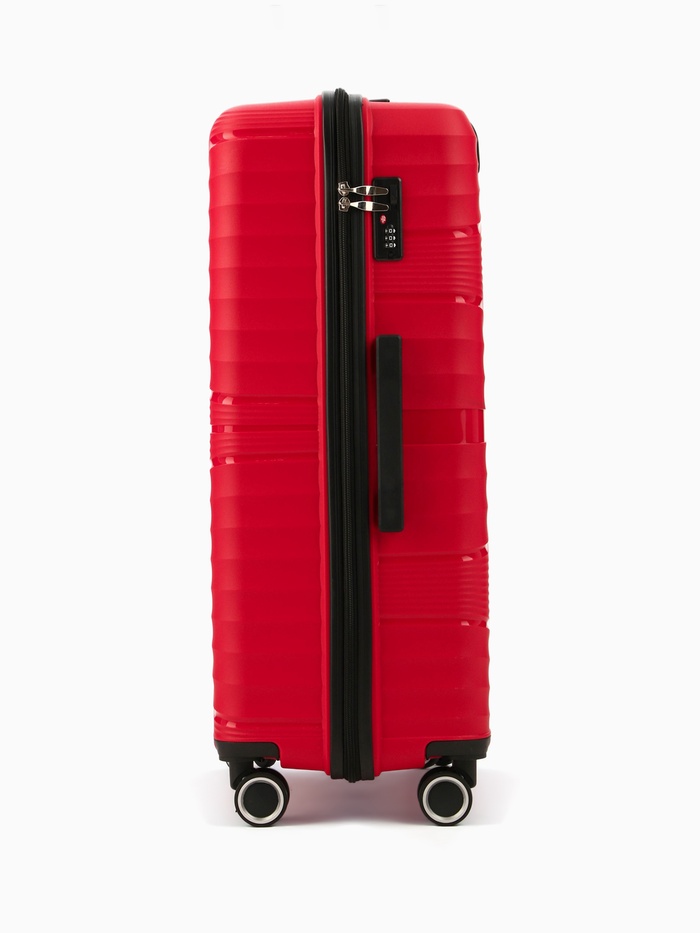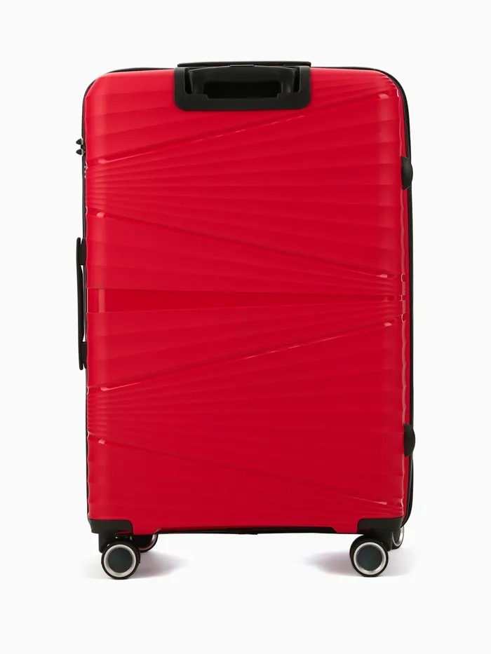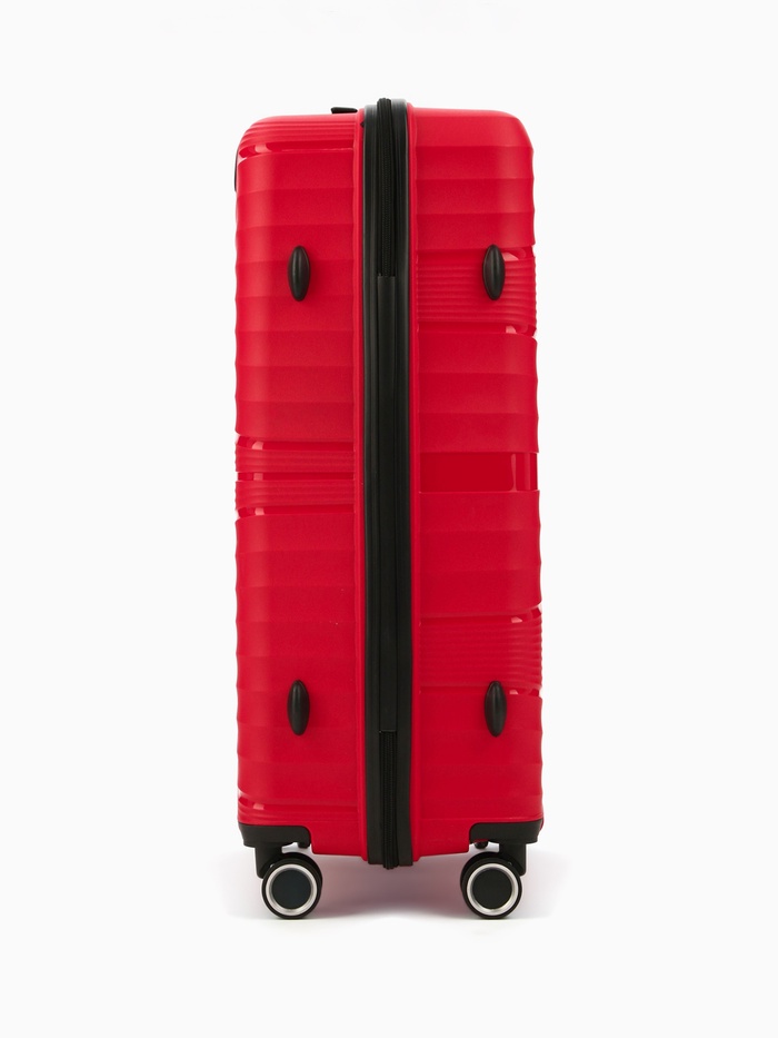 - Эстетически привлекательный красный цвет делает чемодан выделяющимся среди других.