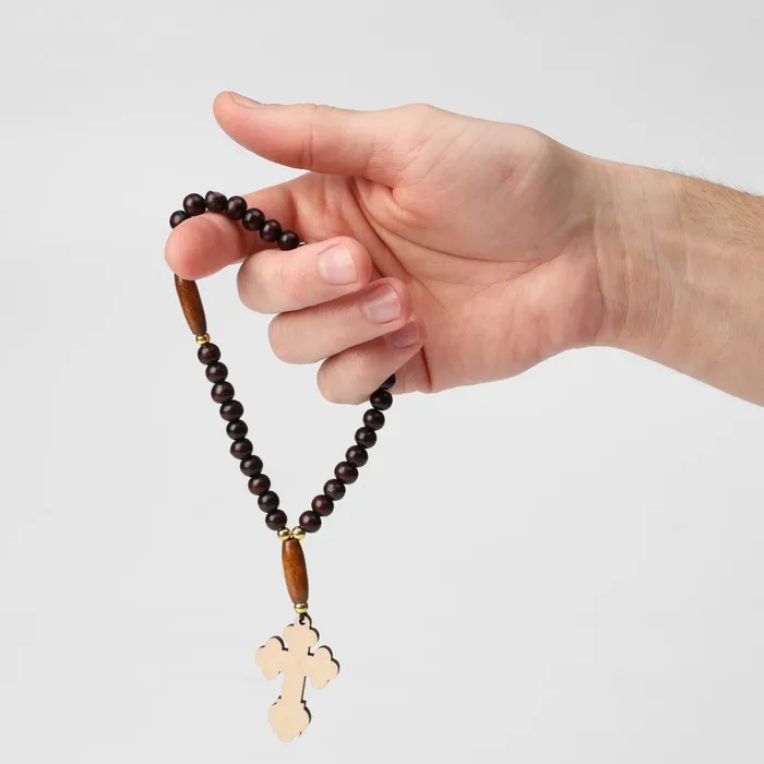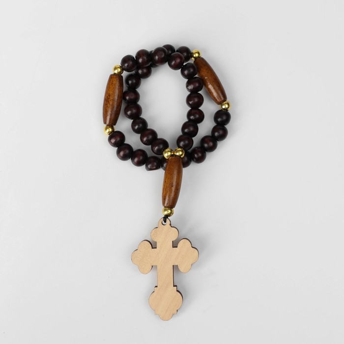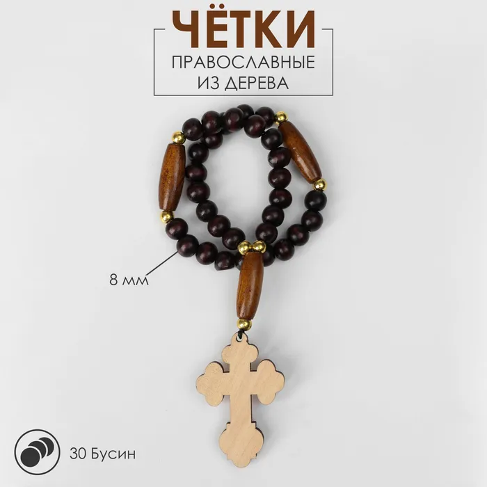 Православные чётки изготовлены из дерева, имеют 30 бусин, перемычки из пластика и подвеску-крест. Аксессуар предназначен для достижения концентрации и покоя во время медитации, также часто используется как стильное украшение на зеркало машины.